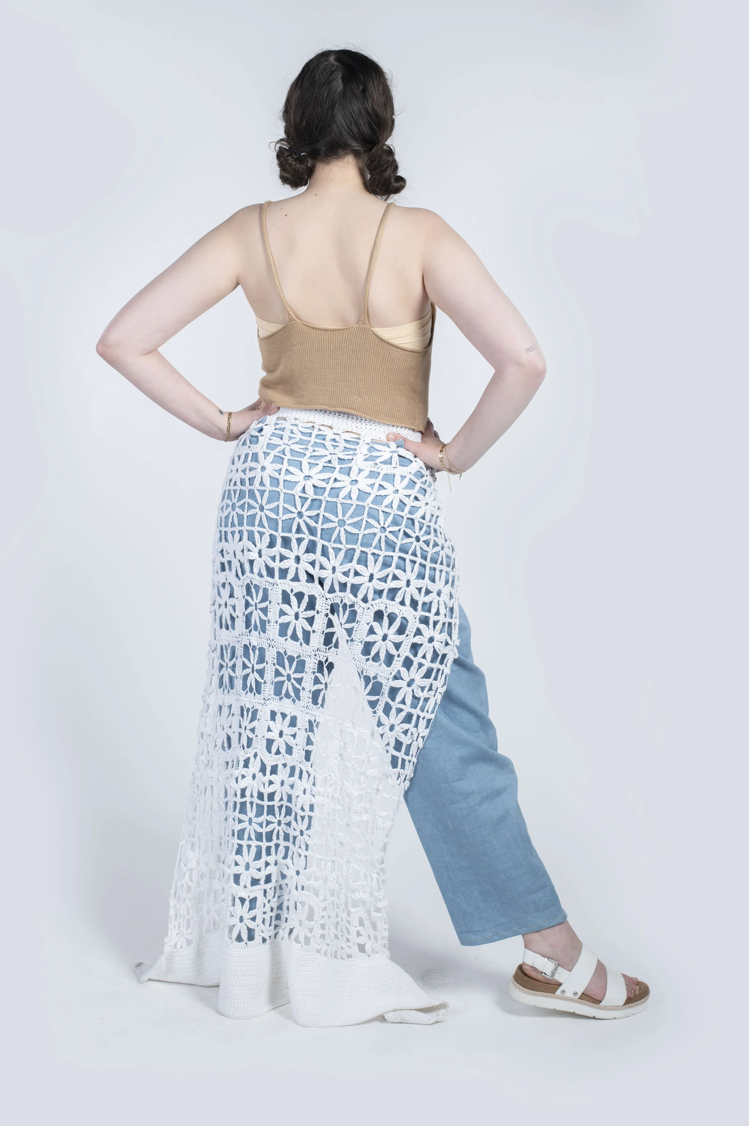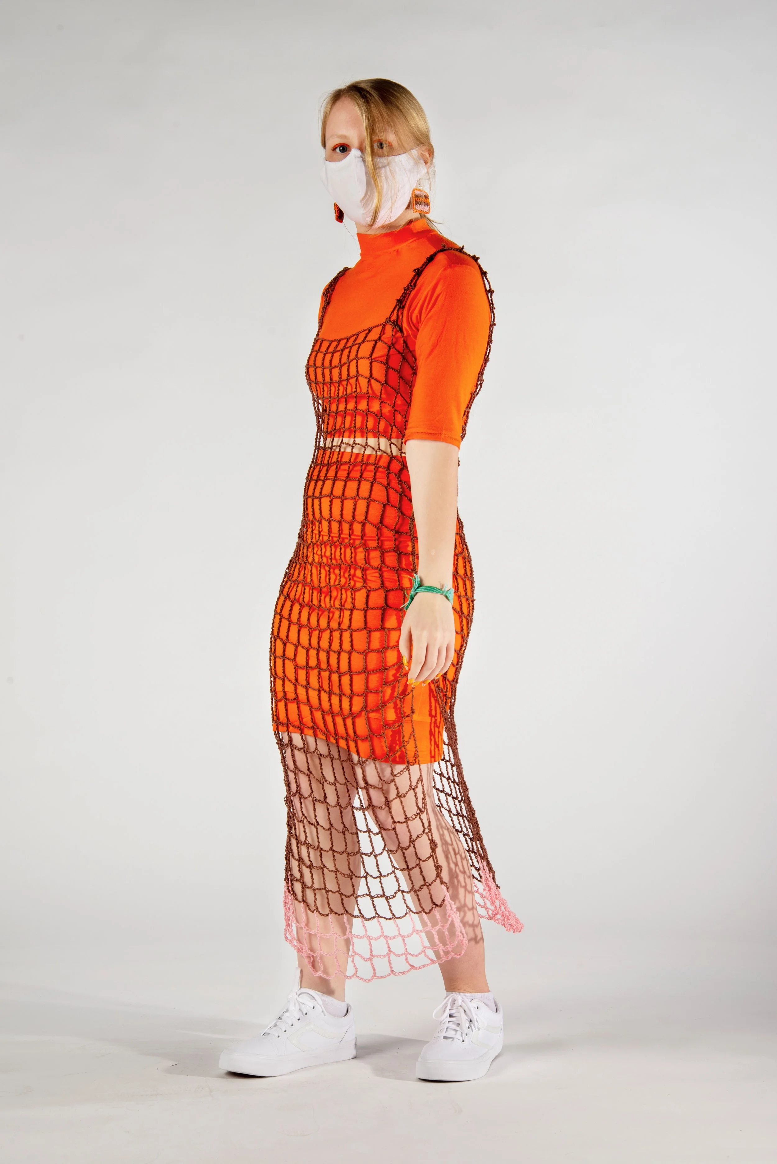 This collection was created through the techniques of crocheting, and sewing. Additionally each look of this collection features handmade accessories such as stuffed crocheted earrings, and a purse