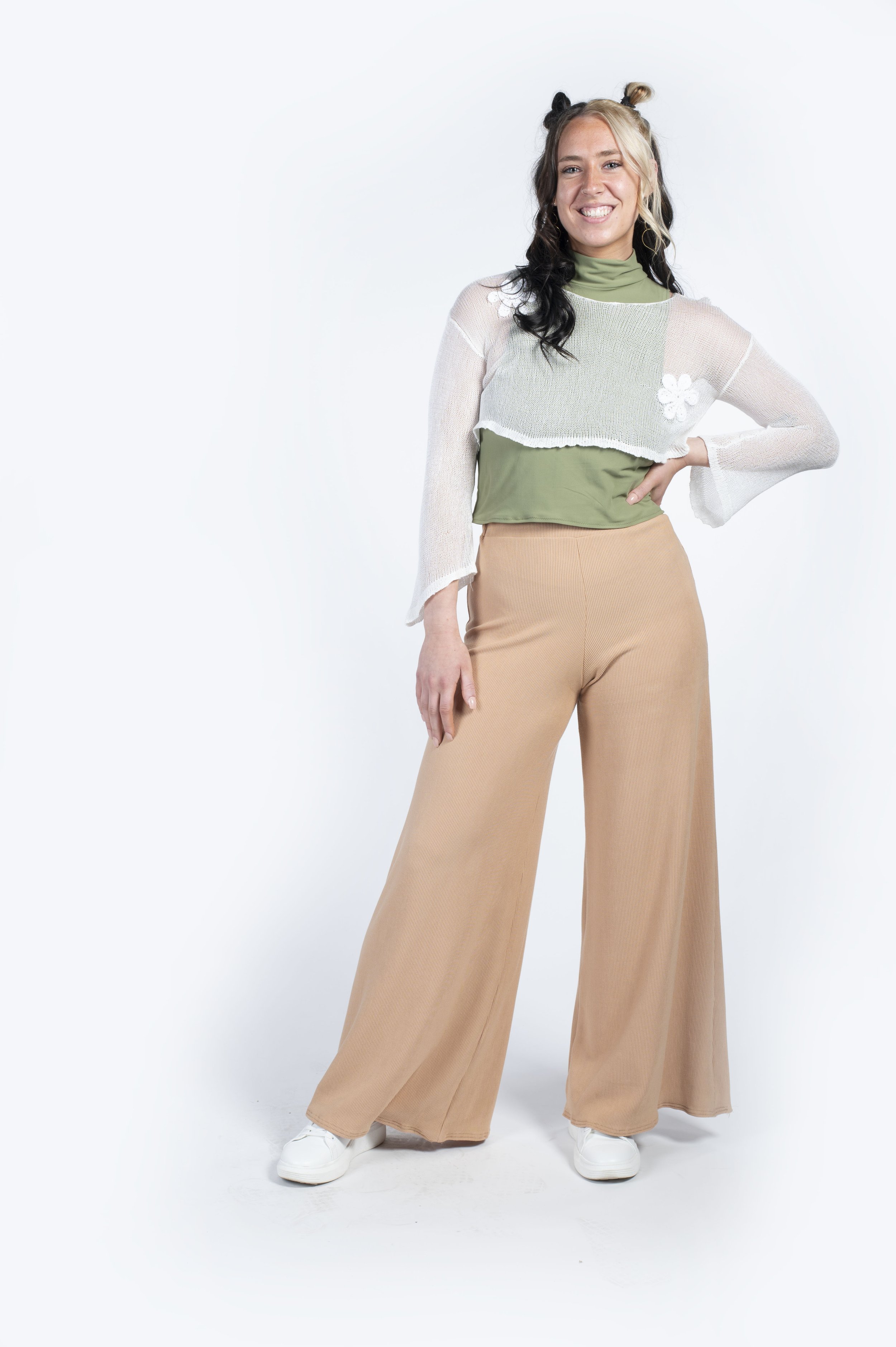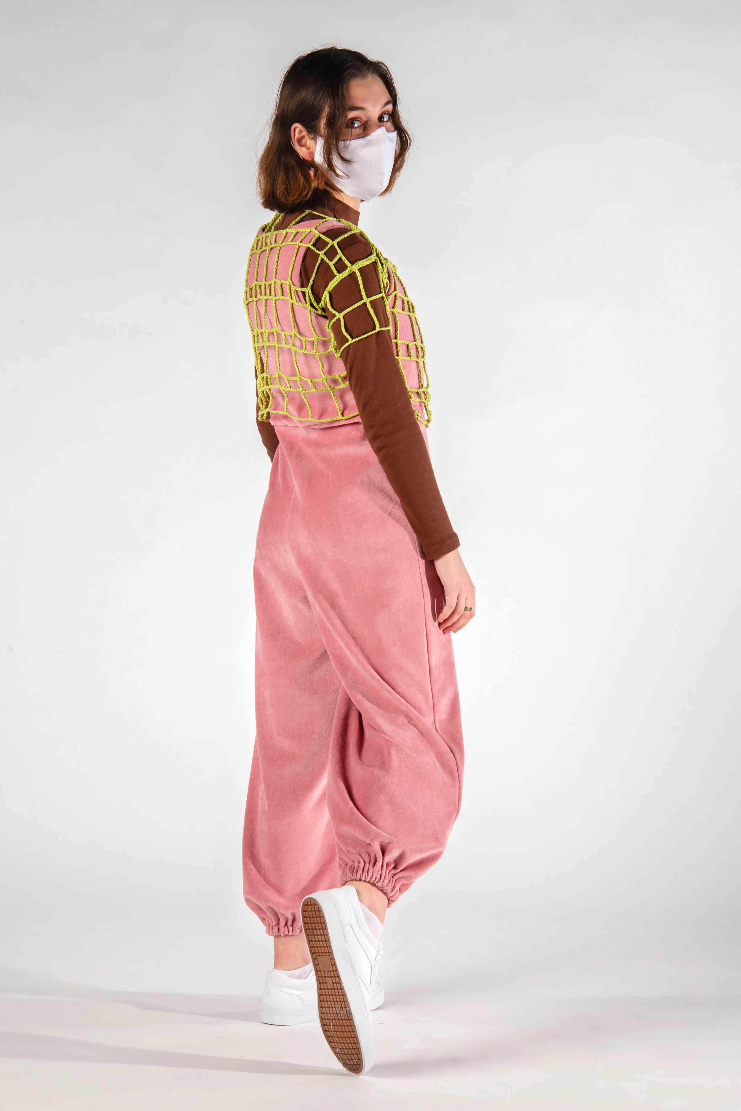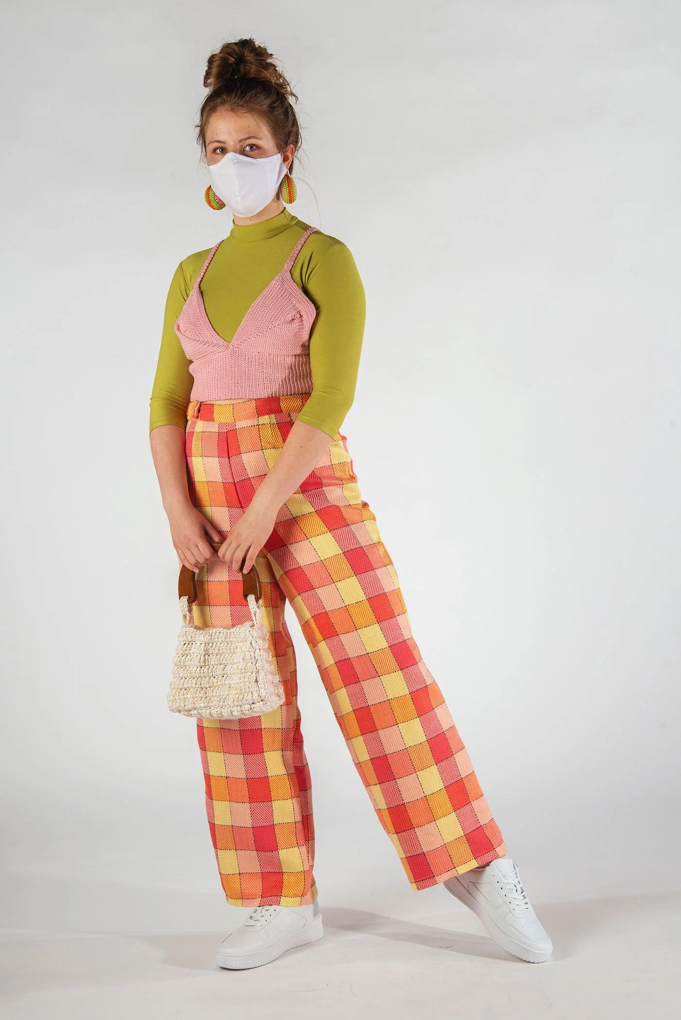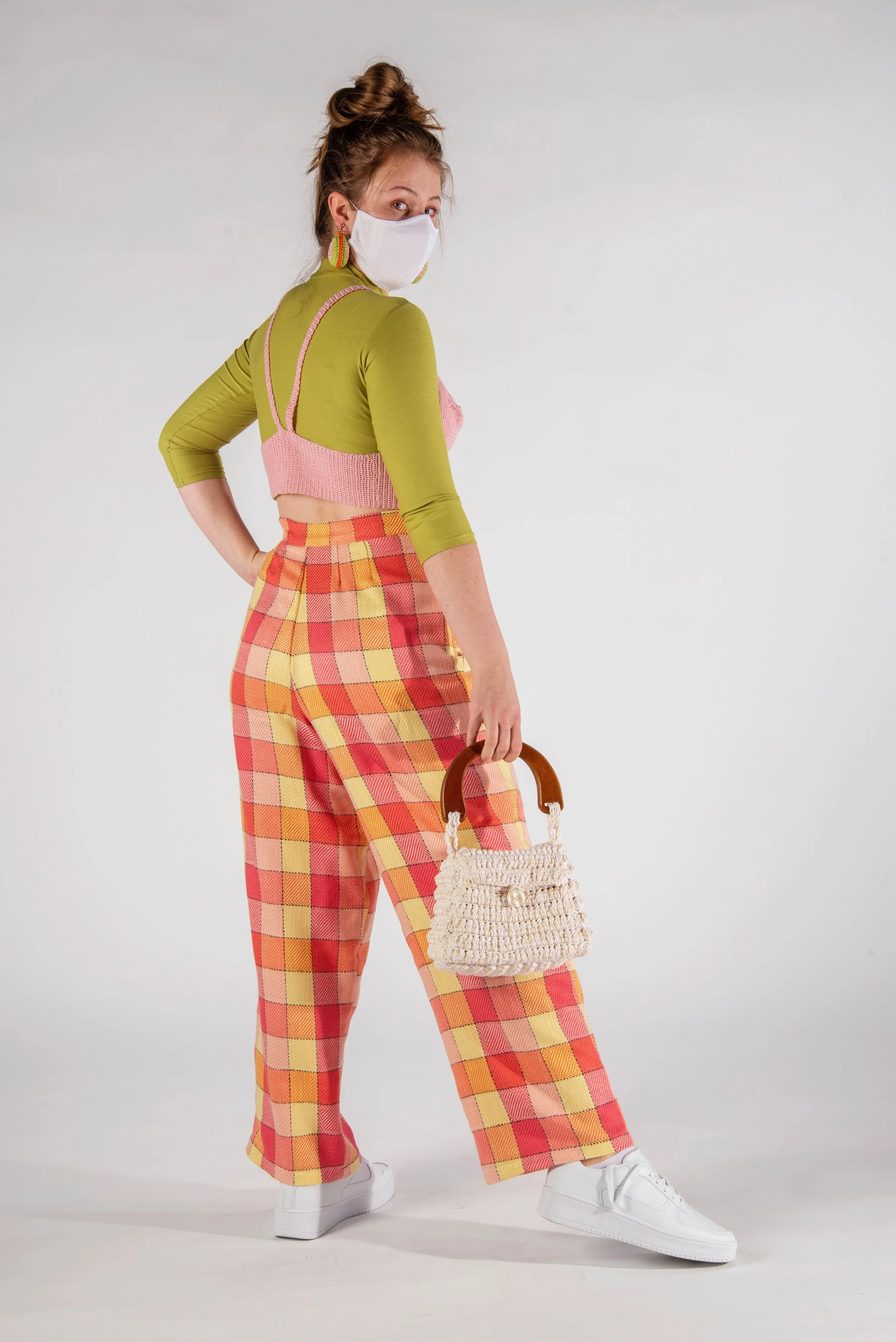 A Nod to Mod is a three look collection inspired by home decor and interior design of the 1970s. Bright shades of orange and chartreuse, soft shades of pink, and neutral tones of white and brown are found throughout this collection. These colors are derived from images of conservation pits, wallpapers, and carpets during this decade. The plaid fabric used for pants, and crocheted mesh dress are inspired by bathroom and floor tiles seen in the homes throughout the 70s. This collection is designed to create joy in those wearing the clothing, as well as those viewing it.