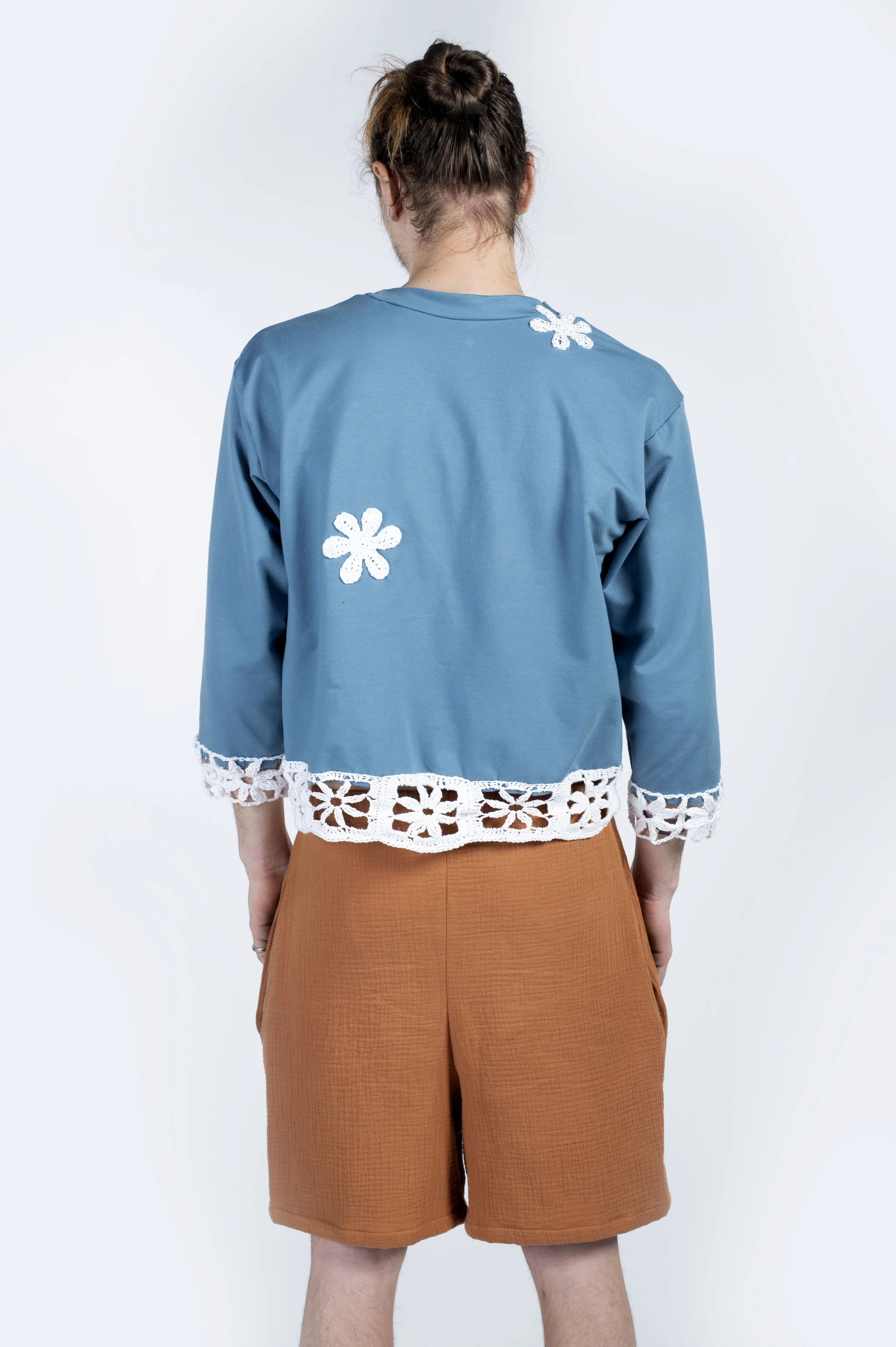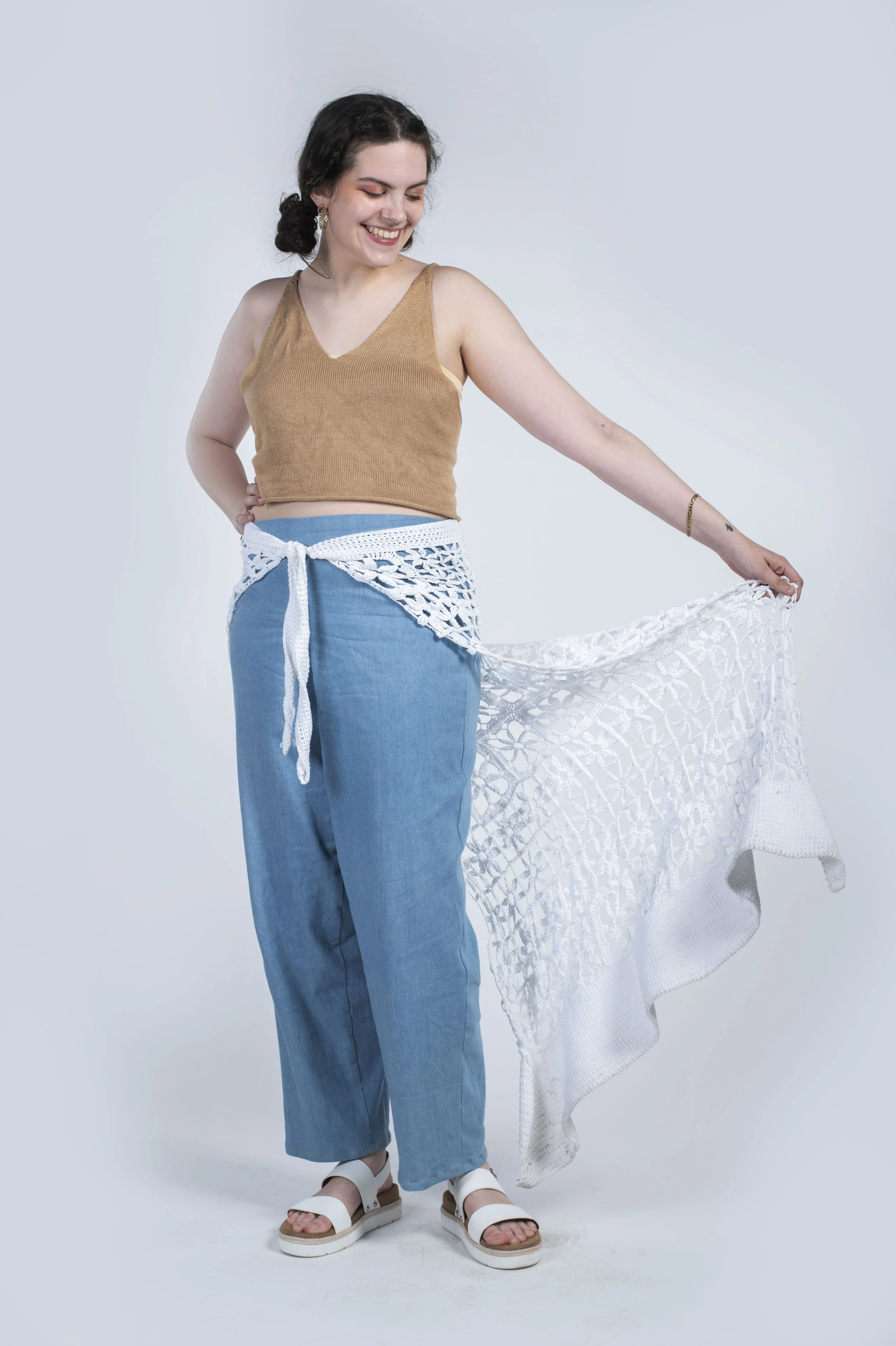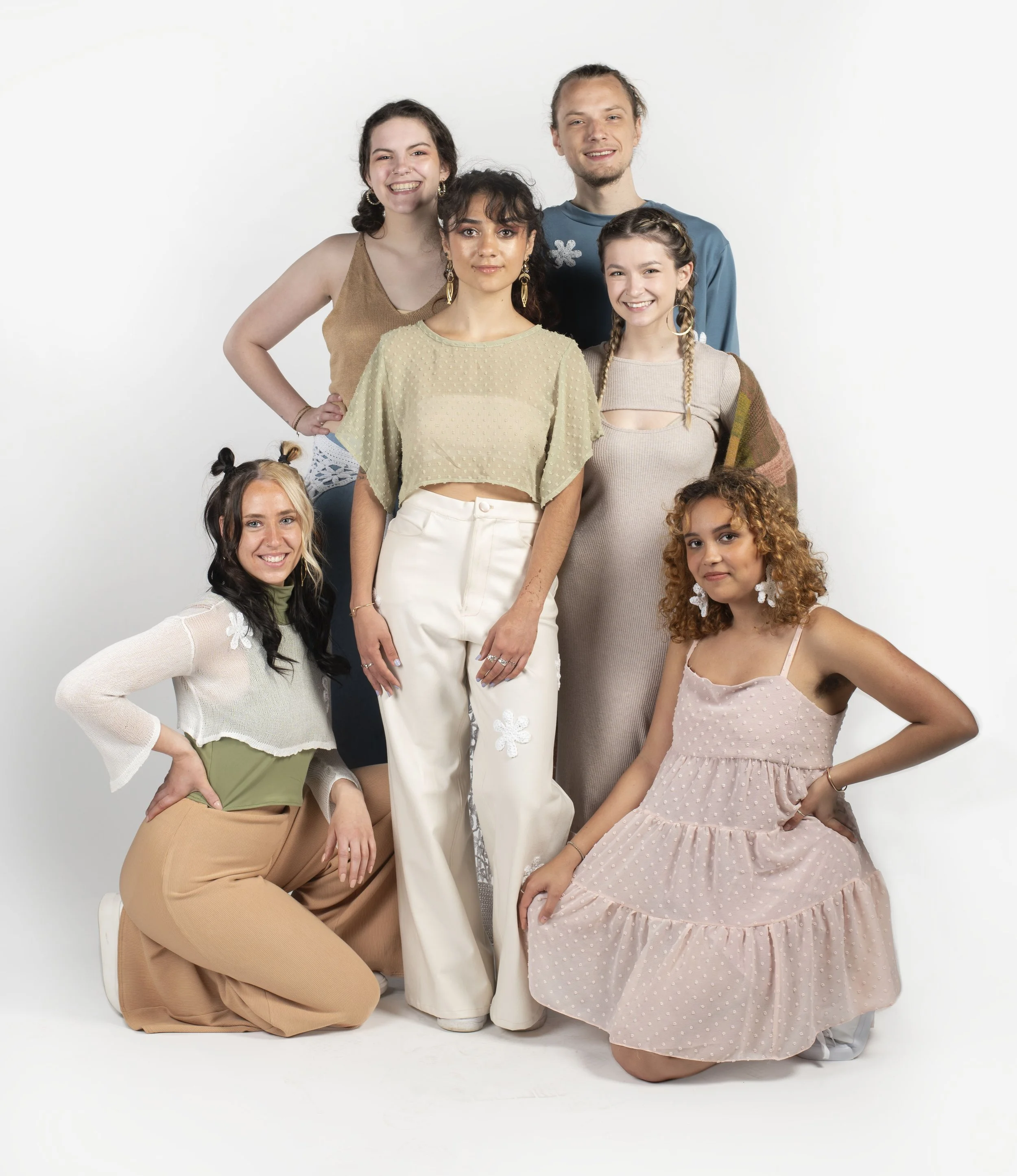 This collection was created through the techniques of machine knitting, crocheting, hand sewing, and sewing. Additionally this collection features handmade accessories such as crocheted flower earrings, and a pair of dangle earrings created from brass, nickel silver, and sterling silver .